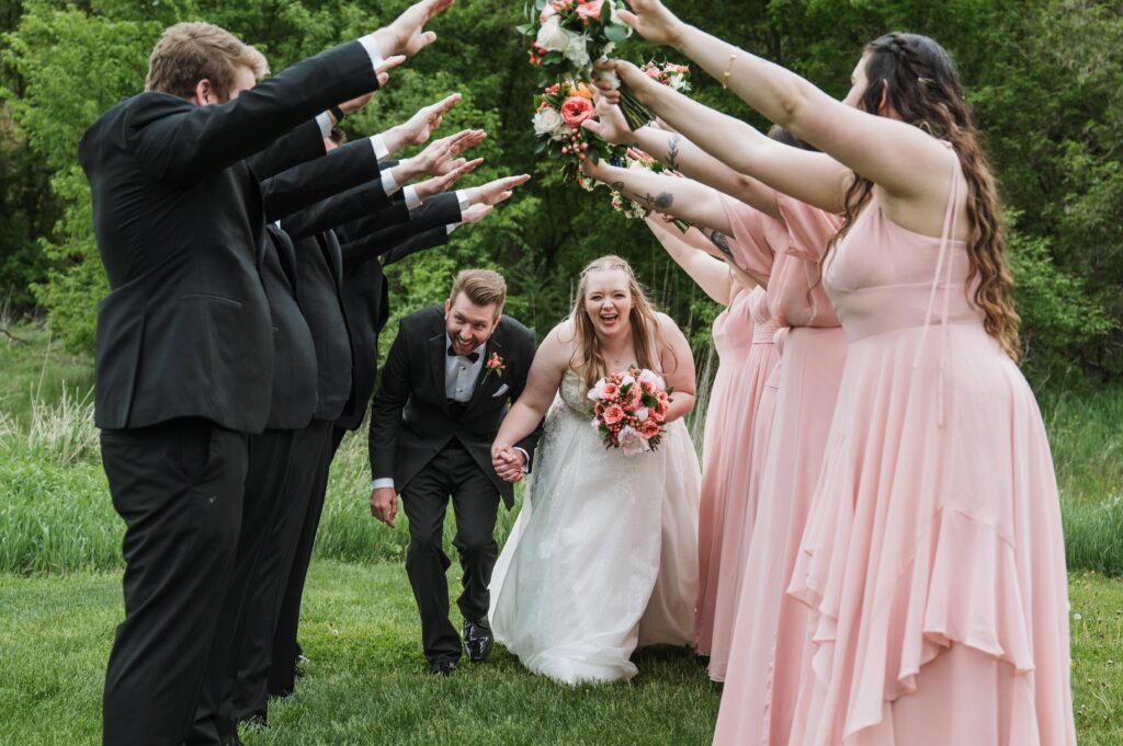 After Cate and Alan’s first look, the wedding party used our 6 acres property for onsite photos. The cream city brick farmhouse, prairie-esque grass, and lush green, wooded backdrop made for stunning photo locations around the venue’s grounds.